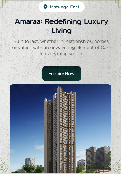 Discover Amaraa in Matunga East, where luxury meets refined living. Our exquisitely designed apartments feature modern amenities and high-end finishes, offering a sophisticated lifestyle. Built to last, whether in relationships, homes, or values with an unwavering element of Care in everything we do.